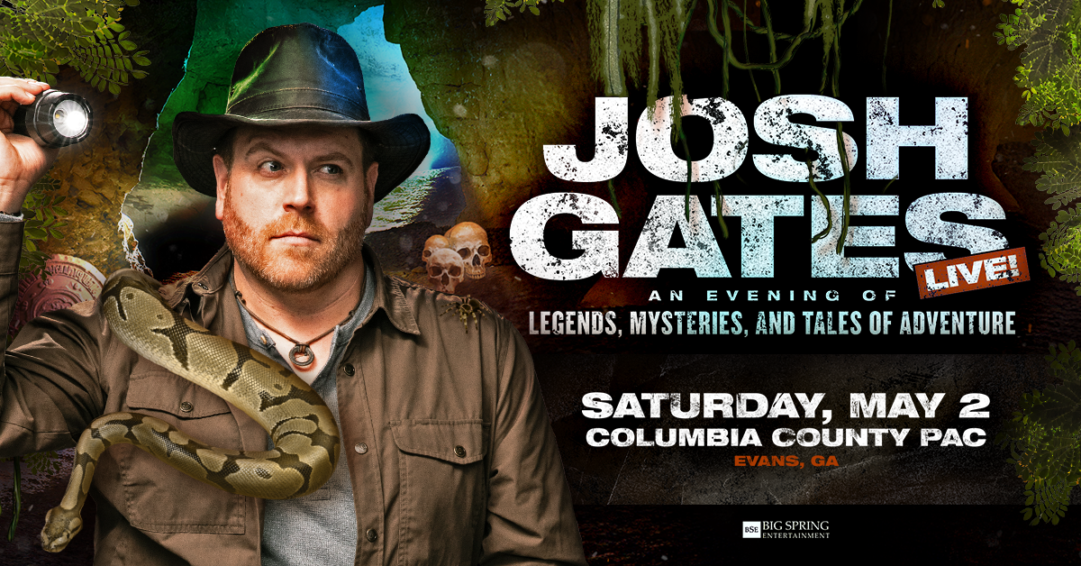 Back to All Events Josh Gates: An Evening of Legends, Mysteries, and Tales of Adventure Saturday, May 2, 2026 7:00 PM 9:00 PM Columbia County Performing Arts Center Evans, GA (map) Google Calendar ICS Tickets >